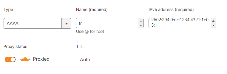 1. 在 DNS 设置中添加一条 AAAA 记录,指向服务器 IPv6 地址。